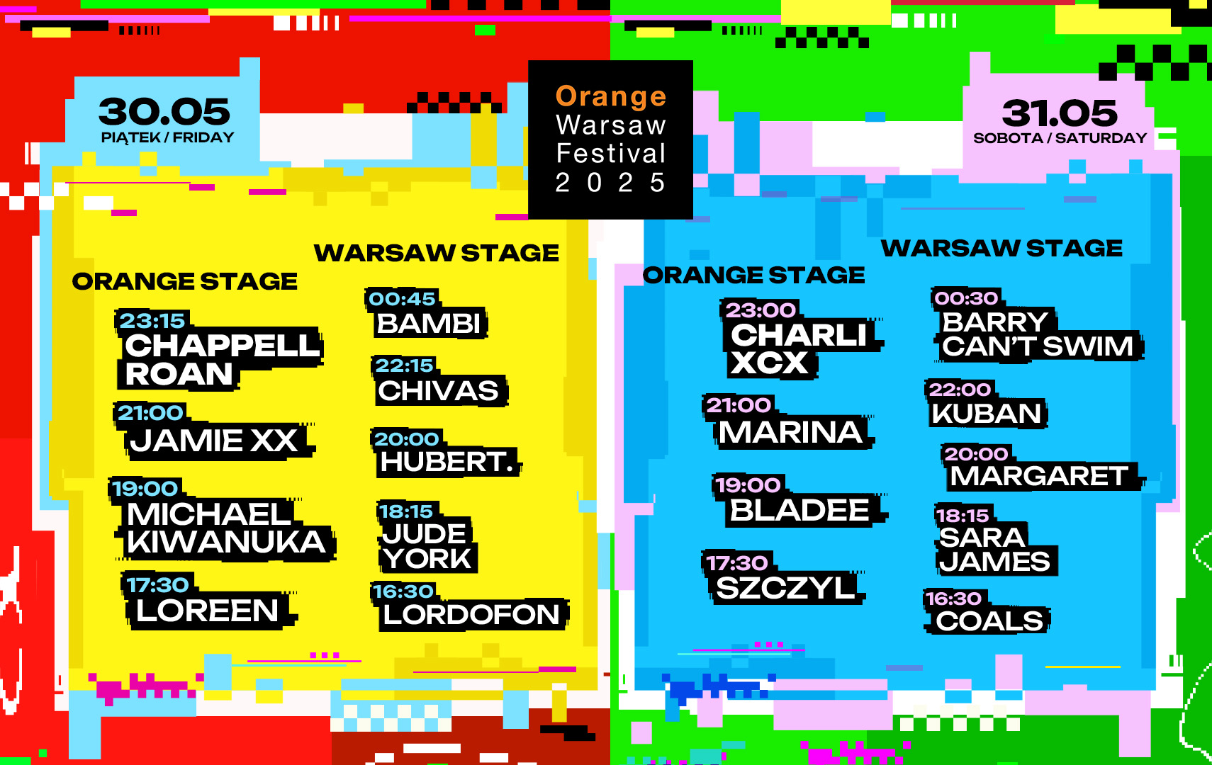 "lead": "<span data-tag=\"p\">Chappell Roan! Midwest Princess headlinerką Orange Warsaw Festival 2025! HOT TO GO! Nowa, niezwykle wszechstronna super-gwiazda globalnego alt-popu dołącza do ogłoszonej już sobotniej headlinerki - Charli xcx. Co to jest za skład! Dwie artystki z absolutnej światowej topki, zdobywczynie tegorocznych nagród Grammy i kreatorki bieżących, muzycznych trendów na jednym festiwalu w Warszawie. W piątek dołączymy do Pink Pony Club, a sobota będzie BRAT!<!--/p--></span>\n<span data-tag=\"p\">Na tegorocznej edycji OWF meldują się również Michael Kiwanuka - mistrz niezwykłych emocji, a także Barry Can't Swim - przyszłość światowej elektroniki.<!--/p--></span>\n<span data-tag=\"p\">Widzimy się w dniach 30-31 maja, na Torze Wyścigów Konnych Służewiec w Warszawie!<!--/p--></span>",