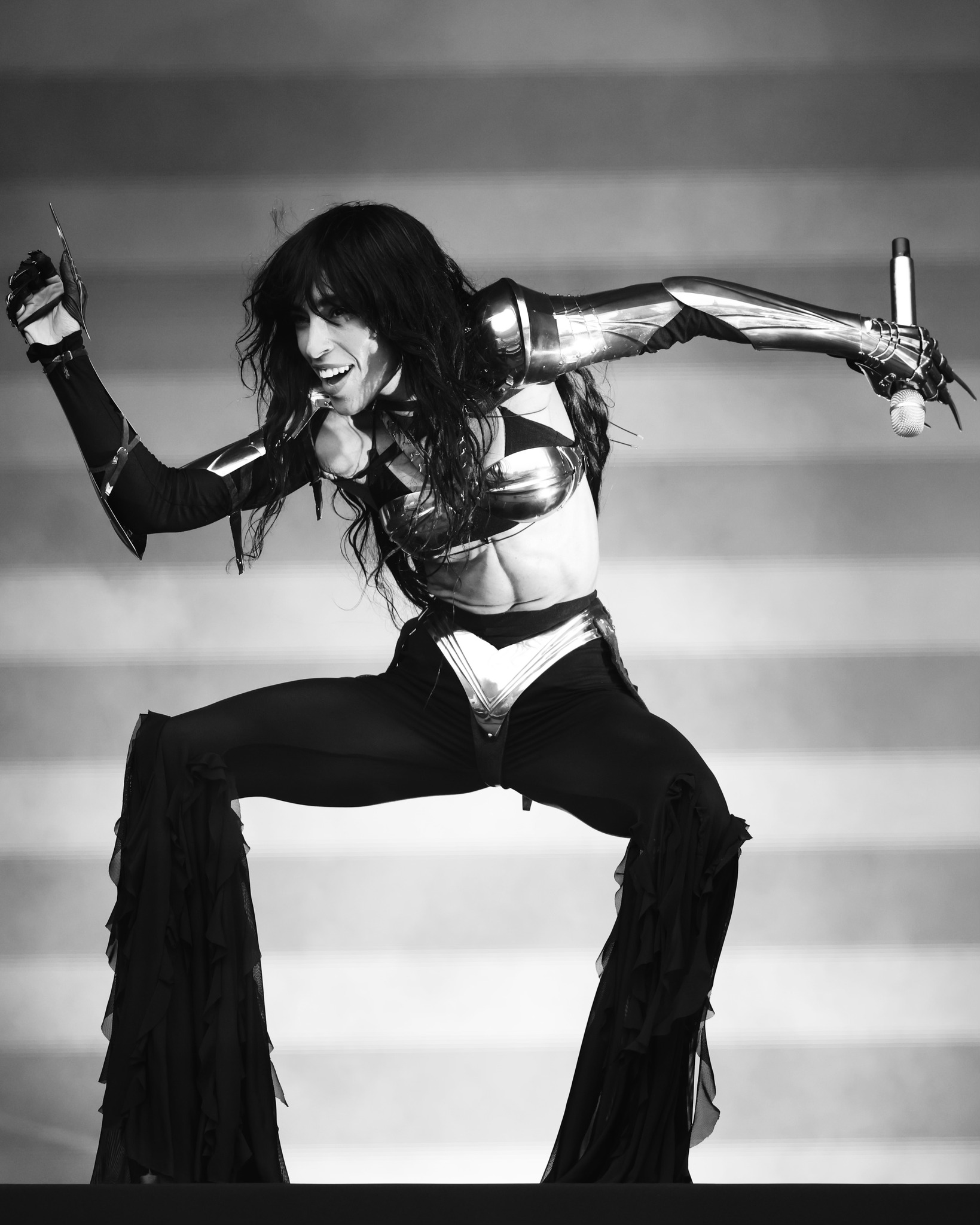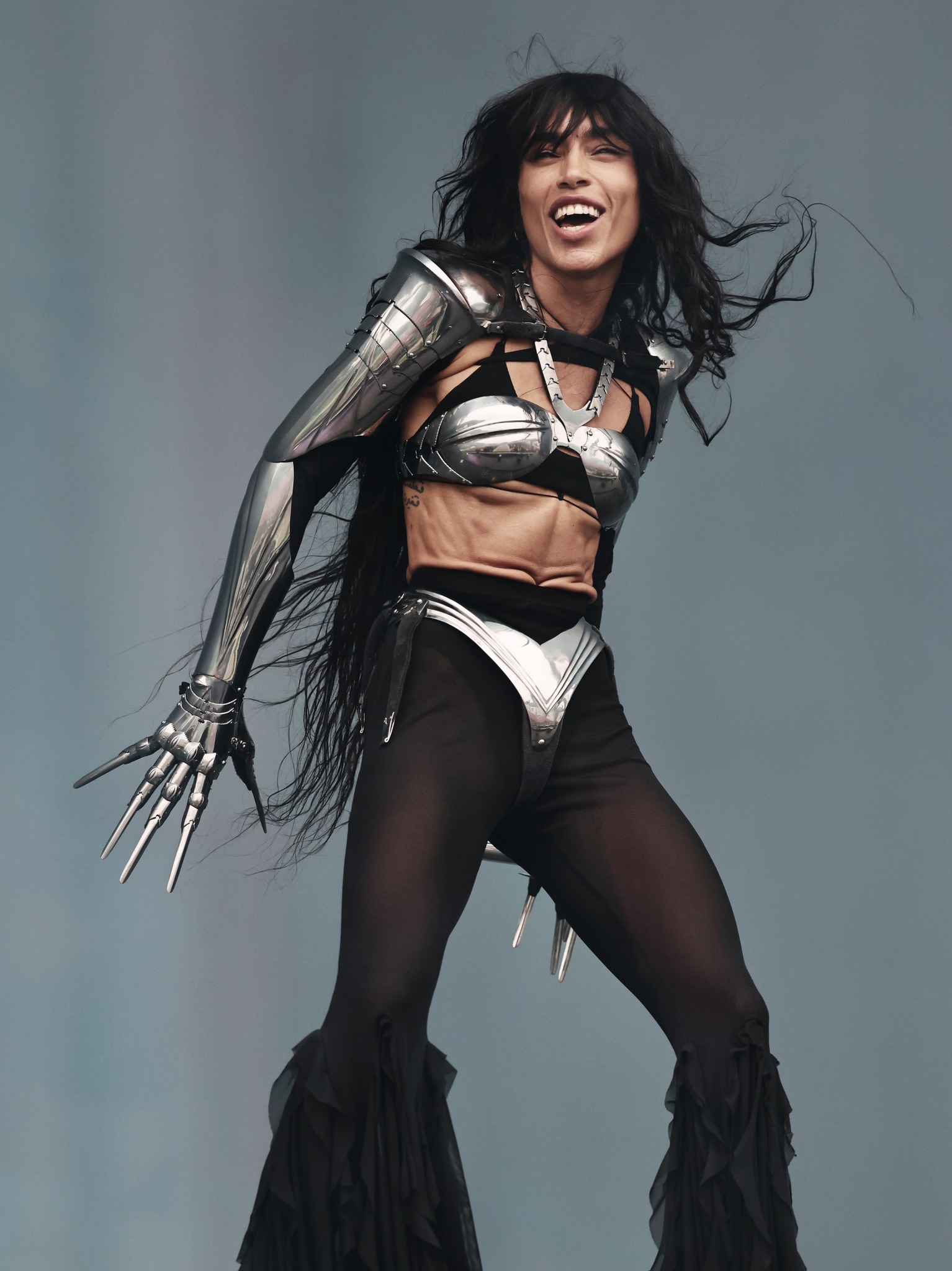 "alt": "Artystka ubrana w czarną sukienkę i kozaki w panterkę pozuje na jasnym tle",